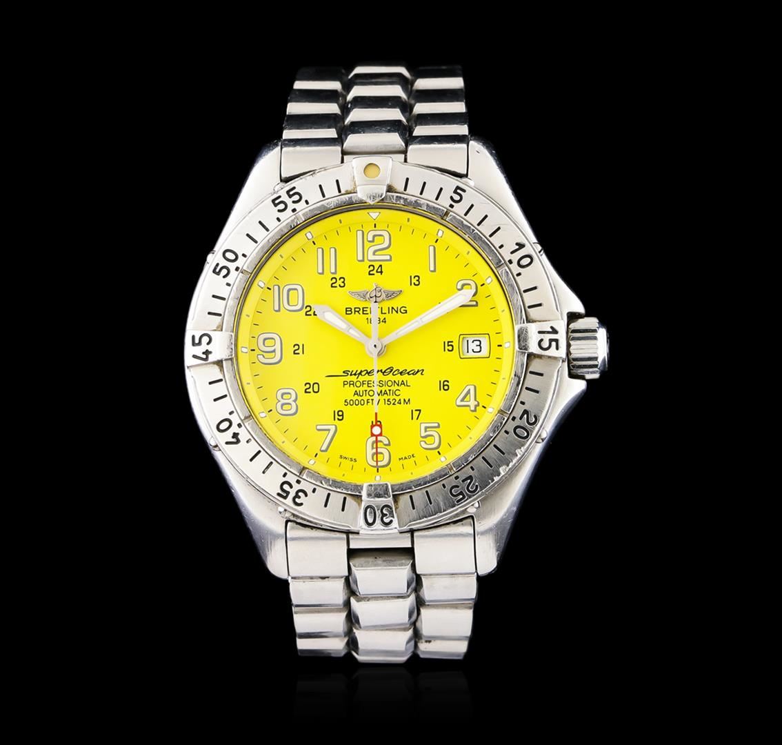 One Breitling SuperOcean watch featuring: Case: Stainless steel. Bezel: Stainless steel, rotating. Dial: Yellow color; white/silver tone hands; white/silver tone hour numerals. Features: Date window located at the 3 o'clock position. Bracelet: Stainless steel. Condition: Minor surface scratches can be seen.