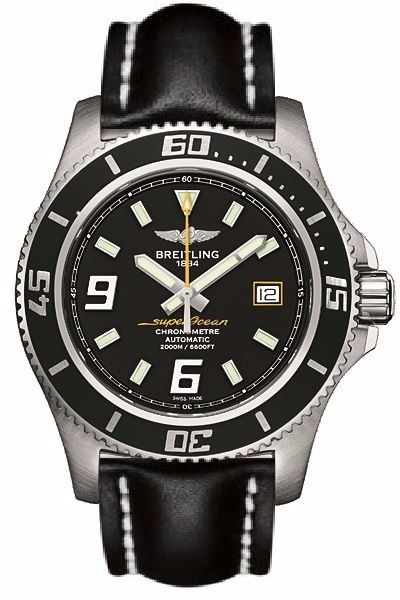 Model: A1739102/BA78-LST - CASE = [Material:Brushed and Polished Stainless Steel], [Case Diameter:44], [Bezel:Uni-Directional Divers, Engraved with Arabic Numerals], [Case Back:Solid], [Water Resistant:2000 Meters - 6000 Feet], [Crystal:Scratch Resistant Sapphire],; DIAL = [Color:Black with Abyss Yellow Accents, Luminescent Index and Arabic Markers, Date at 3],; MOVEMENT = [Type:Breitling Calibre 17 Automatic Self Winding], [Crown:Screw Down],; BAND = [Clasp:Tang Buckle (also available with deployment buckle)], [Type:Black Calfskin Leather], (Usually ships in 1 to 2 weeks.)
