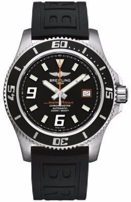 Model: A1739102/BA80-RS - CASE = [Material:Stainless Steel], [Case Diameter:44], [Bezel:Uni-Directional Divers, Engraved with Arabic Numerals], [Case Back:Solid], [Water Resistant:2000 Meters - 6000 Feet], [Crystal:Scratch Resistant Sapphire],; DIAL = [Color:Black with Abyss Orange Accents, Luminescent Index and Arabic Markers, Date at 3],; MOVEMENT = [Type:Breitling Calibre 17 Automatic Self Winding], [Crown:Screw Down],; BAND = [Clasp:Tang Buckle], [Type:Black Diver Pro ll Rubber], (Usually ships in 1 to 2 weeks.)
