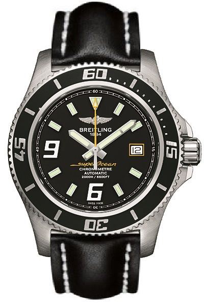 Model: A1739102/BA78-LST - CASE = [Material:Brushed and Polished Stainless Steel], [Case Diameter:44], [Bezel:Uni-Directional Divers, Engraved with Arabic Numerals], [Case Back:Solid], [Water Resistant:2000 Meters - 6000 Feet], [Crystal:Scratch Resistant Sapphire], DIAL = [Color:Black with Abyss Yellow Accents, Luminescent Index and Arabic Markers, Date at 3], MOVEMENT = [Type:Breitling Calibre 17 Automatic Self Winding], [Crown:Screw Down], BAND = [Clasp:Tang Buckle (also available with deployment buckle)], [Type:Black Calfskin Leather], (Usually ships in 1 to 2 weeks.)