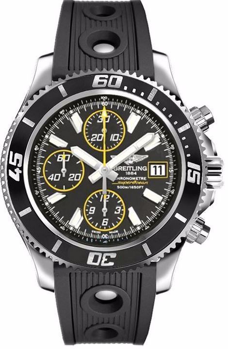 Model: A13341A8/BA82-200S - CASE = [Material:Stainless Steel], [Case Diameter:44], [Case Thickness:17.2mm], [Bezel:Uni-Directional Divers, Engraved with Arabic Numerals], [Case Back:Solid], [Water Resistant:500 Meters/1650 Feet], [Crystal:Scratch Resistant Sapphire],; DIAL = [Color:Black Chronograph with Abyss Yellow Accents, Luminescent Index Markers, Date at 3],; MOVEMENT = [Type:Breitling Calibre 13 Automatic Self Winding], [Crown:Screw Down],; BAND = [Clasp:Deployment Buckle], [Type:Black Ocean Racer Rubber], (Usually ships in 1 to 2 weeks.)