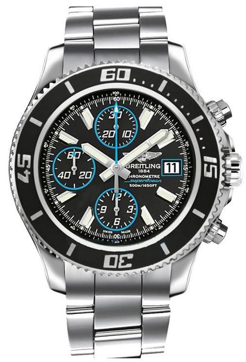 Model: A13341A8/BA83-163A - CASE = [Material:Stainless Steel], [Case Diameter:44], [Case Thickness:17.2mm], [Bezel:Uni-Directional Divers, Engraved with Arabic Numerals], [Case Back:Solid], [Water Resistant:500 Meters/1650 Feet], [Crystal:Scratch Resistant Sapphire], DIAL = [Color:Black Chronograph with Abyss Blue Accents, Luminescent Index Markers, Date at 3], MOVEMENT = [Type:Breitling Calibre 13 Automatic Self Winding], [Crown:Screw Down], BAND = [Clasp:Double Locking Foldover Clasp], [Type:Polished Stainless Steel], (Usually ships in 1 to 2 weeks.)