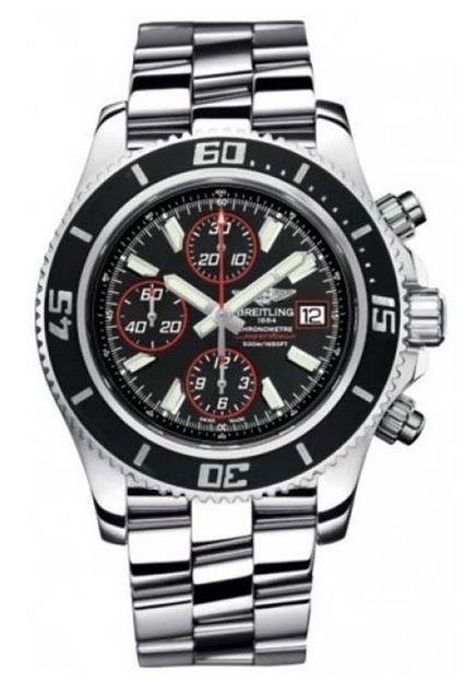 Model: A13341A8/BA81-163A - CASE = [Material:Stainless Steel], [Case Diameter:44], [Case Thickness:17.2mm], [Bezel:Uni-Directional Divers, Engraved with Arabic Numerals], [Case Back:Solid], [Water Resistant:500 Meters/1650 Feet], [Crystal:Scratch Resistant Sapphire], DIAL = [Color:Black Chronograph with Abyss Red Accents, Luminescent Index Markers, Date at 3], MOVEMENT = [Type:Breitling Calibre 13 Automatic Self Winding], [Crown:Screw Down], BAND = [Clasp:Double Locking Foldover Clasp], [Type:Polished Stainless Steel], (Usually ships in 1 to 2 weeks.)