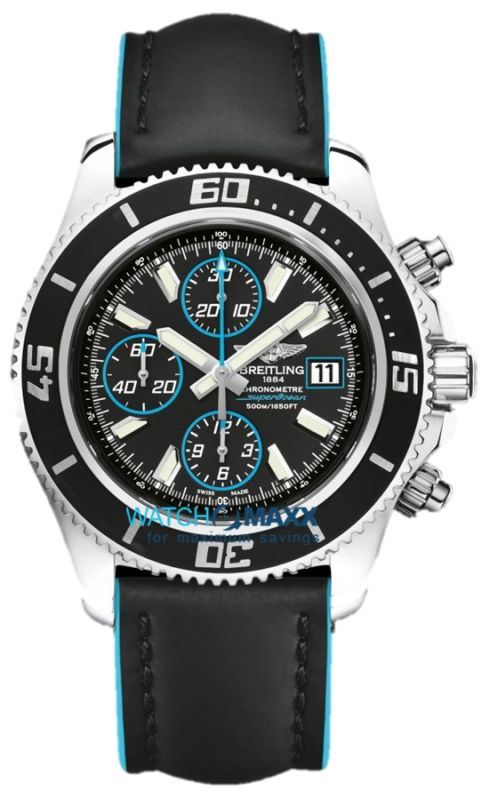 Model: A13341A8/BA83-LST - CASE = [Material:Stainless Steel], [Case Diameter:44], [Case Thickness:17.2mm], [Bezel:Uni-Directional Divers, Engraved with Arabic Numerals], [Case Back:Solid], [Water Resistant:500 Meters/1650 Feet], [Crystal:Scratch Resistant Sapphire], DIAL = [Color:Black Chronograph with Abyss Blue Accents, Luminescent Index Markers, Date at 3], MOVEMENT = [Type:Breitling Calibre 13 Automatic Self Winding], [Crown:Screw Down], BAND = [Clasp:Tang Buckle], [Type:Black Calfskin Leather], (Usually ships in 1 to 2 weeks.)