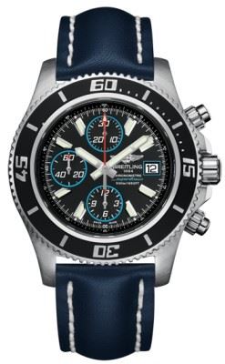 Model: A1334102/BA83-LS - CASE = [Material:Stainless Steel], [Case Diameter:44], [Bezel:Uni-Directional Divers, Engraved with Arabic Numerals], [Case Back:Solid], [Water Resistant:500 Meters/1650 Feet], [Crystal:Scratch Resistant Sapphire], DIAL = [Color:Black Chronograph with Abyss Blue Accents, Luminescent Index Markers, Date at 3], MOVEMENT = [Type:Breitling Calibre 13 Automatic Self Winding], [Crown:Screw Down], BAND = [Clasp:Tang Buckle (also available with deployment buckle)], [Type:Blue Calfskin Leather], (Usually ships in 1 to 2 weeks.)
