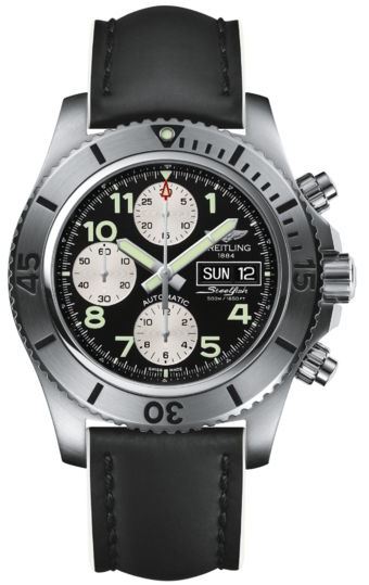 Model: A13341C3/BD19-226X - CASE = [Material:Stainless Steel], [Case Diameter:44], [Bezel:Unidirectional rotating], [Water Resistant:500 Meters - 1650 Feet], [Crystal:Scratch Resistant Sapphire], DIAL = [Color:Black], MOVEMENT = [Type:Chronograph Automatic Self Winding], [Crown:Screw Down], BAND = [Clasp:Pin & Buckle], [Type:Black Leather with White Underside], (In Stock - Ready to ship.)