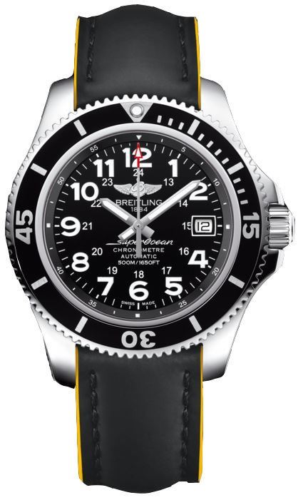 Model: A17365C9/BD67-225X - CASE = [Material:Stainless Steel], [Case Diameter:42], [Case Thickness:13.30mm], [Bezel:Uni-Directional Rotating], [Case Back:Solid], [Water Resistant:500 Meters - 1650 Feet], [Crystal:Scratch Resistant Sapphire],; DIAL = [Color:Black],; MOVEMENT = [Type:Automatic Self Winding], [Crown:Screw Down],; BAND = [Clasp:Tang], [Type:Black And Yellow Superocean Leather], (Usually ships in 1 to 2 weeks.)