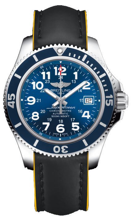 Model: A17365D1/C915-225X - CASE = [Material:Stainless Steel], [Case Diameter:42], [Case Thickness:13.30mm], [Bezel:Uni-Directional Rotating], [Case Back:Solid], [Water Resistant:500 Meters - 1650 Feet], [Crystal:Scratch Resistant Sapphire], DIAL = [Color:Blue], MOVEMENT = [Type:Automatic Self Winding], [Crown:Screw Down], BAND = [Clasp:Tang], [Type:Black And Yellow Superocean Leather], (Usually ships in 1 to 2 weeks.)