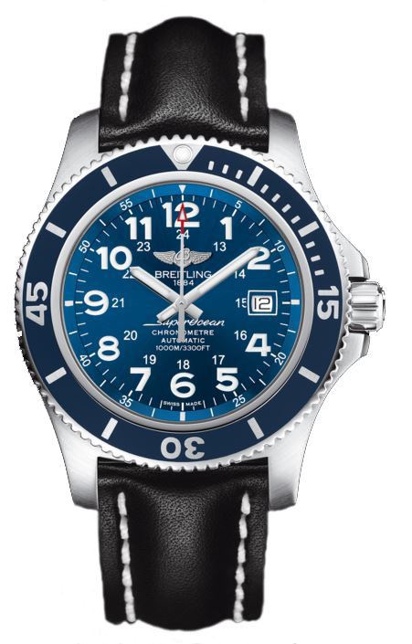Model: A17392D8/C910-436X - CASE = [Material:Stainless Steel], [Case Diameter:44], [Case Thickness:14.20mm], [Bezel:Uni-Directional Rotating], [Case Back:Solid], [Water Resistant:1000 Meters - 3300 Feet], [Crystal:Scratch Resistant Sapphire], DIAL = [Color:Blue], MOVEMENT = [Type:Automatic Self Winding], [Crown:Screw Down], BAND = [Clasp:Folding], [Type:Black Leather], (In Stock - Ready to ship.)