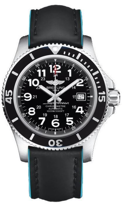 Model: A17392D7/BD68-227X - CASE = [Material:Stainless Steel], [Case Diameter:44], [Case Thickness:14.20mm], [Bezel:Uni-Directional Rotating], [Case Back:Solid], [Water Resistant:1000 Meters - 3300 Feet], [Crystal:Scratch Resistant Sapphire], DIAL = [Color:Black], MOVEMENT = [Type:Automatic Self Winding], [Crown:Screw Down], BAND = [Clasp:Tang], [Type:Black and Blue Superocean Leather], (In Stock - Ready to ship.)