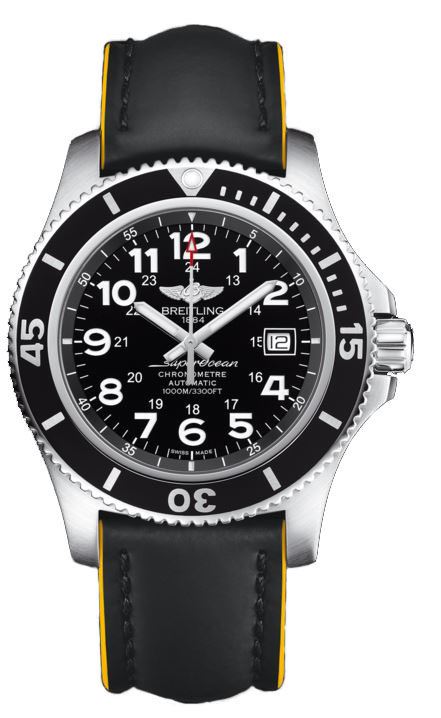 Model: A17392D7/BD68-229X - CASE = [Material:Stainless Steel], [Case Diameter:44], [Case Thickness:14.20mm], [Bezel:Uni-Directional Rotating], [Case Back:Solid], [Water Resistant:1001 Meters - 3300 Feet], [Crystal:Scratch Resistant Sapphire], DIAL = [Color:Black], MOVEMENT = [Type:Automatic Self Winding], [Crown:Screw Down], BAND = [Clasp:Tang], [Type:Black And Yellow Superocean Leather], (Usually ships in 1 to 2 weeks.)