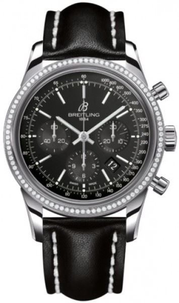 Model: AB015253/BA99-LST - CASE = [Material:Stainless Steel], [Case Diameter:43], [Case Thickness:14.35mm], [Bezel:Fixed with Diamonds], [Case Back:See-thru Sapphire Crystal], [Water Resistant:100 Meters/330 Feet], [Crystal:Scratch Resistant Sapphire], DIAL = [Color:Black Chronograph], MOVEMENT = [Type:Automatic Self Winding Chronograph], BAND = [Clasp:Tang], [Type:Black Calfskin Leather], (Usually ships in 1 to 2 weeks.)