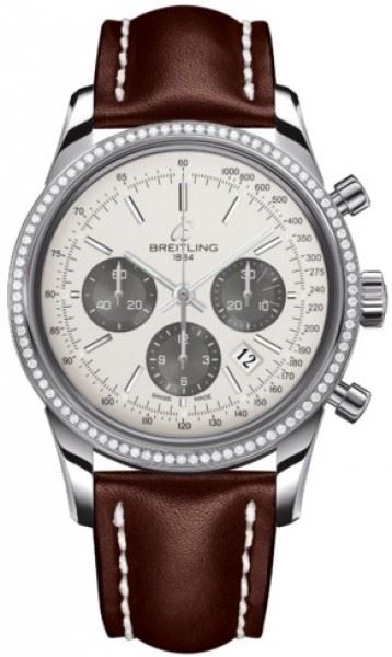 Model: AB015253/G724-LST - CASE = [Material:Stainless Steel], [Case Diameter:43], [Case Thickness:14.35mm], [Bezel:Fixed with Diamonds], [Case Back:See-thru Sapphire Crystal], [Water Resistant:100 Meters/330 Feet], [Crystal:Scratch Resistant Sapphire], DIAL = [Color:Silver Chronograph], MOVEMENT = [Type:Automatic Self Winding Chronograph], BAND = [Clasp:Tang], [Type:Brown Calfskin Leather], (Usually ships in 4 to 8 weeks.)