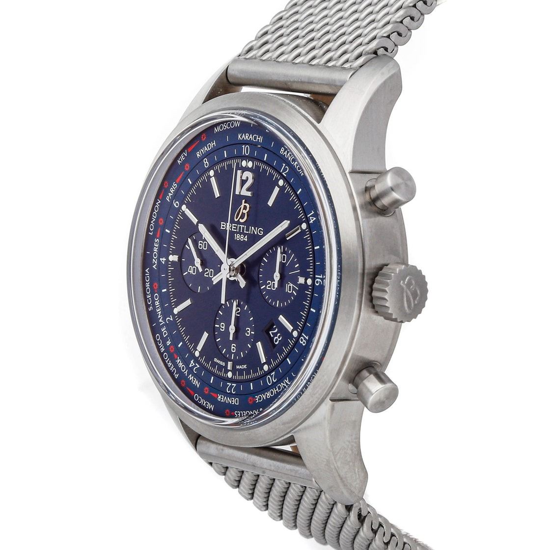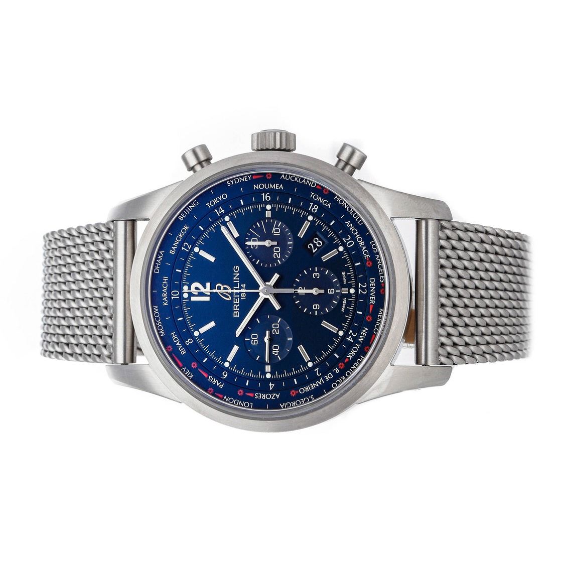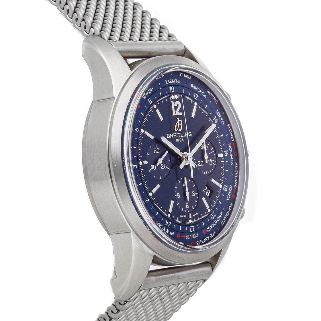Self-winding automatic watch, features a 46mm stainless steel case surrounding a blue dial on a stainless steel Ocean Classic mesh bracelet with folding buckle. Functions include hours, minutes, small seconds, date, chronograph and world time. This watch comes complete with box and papers.
