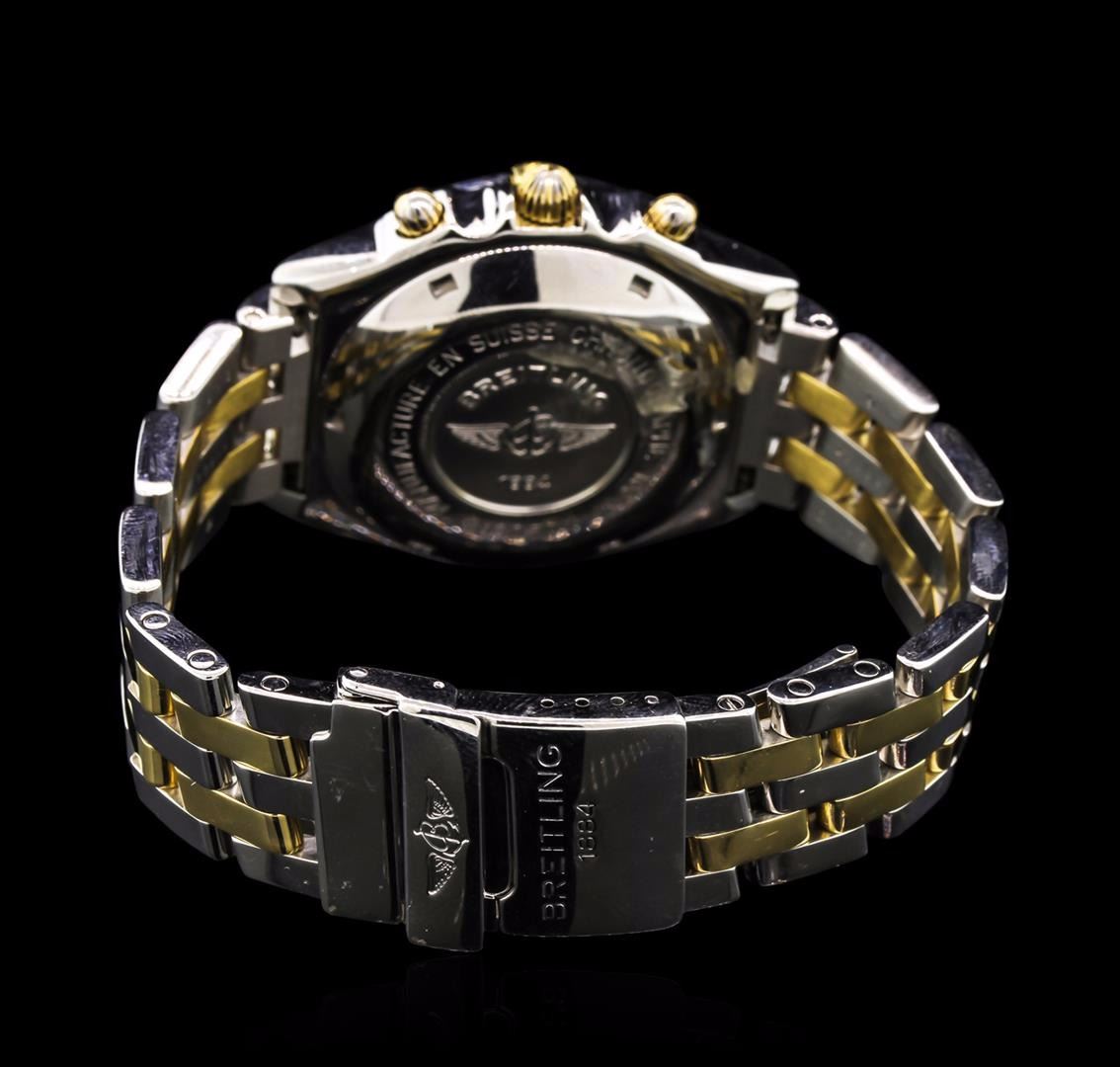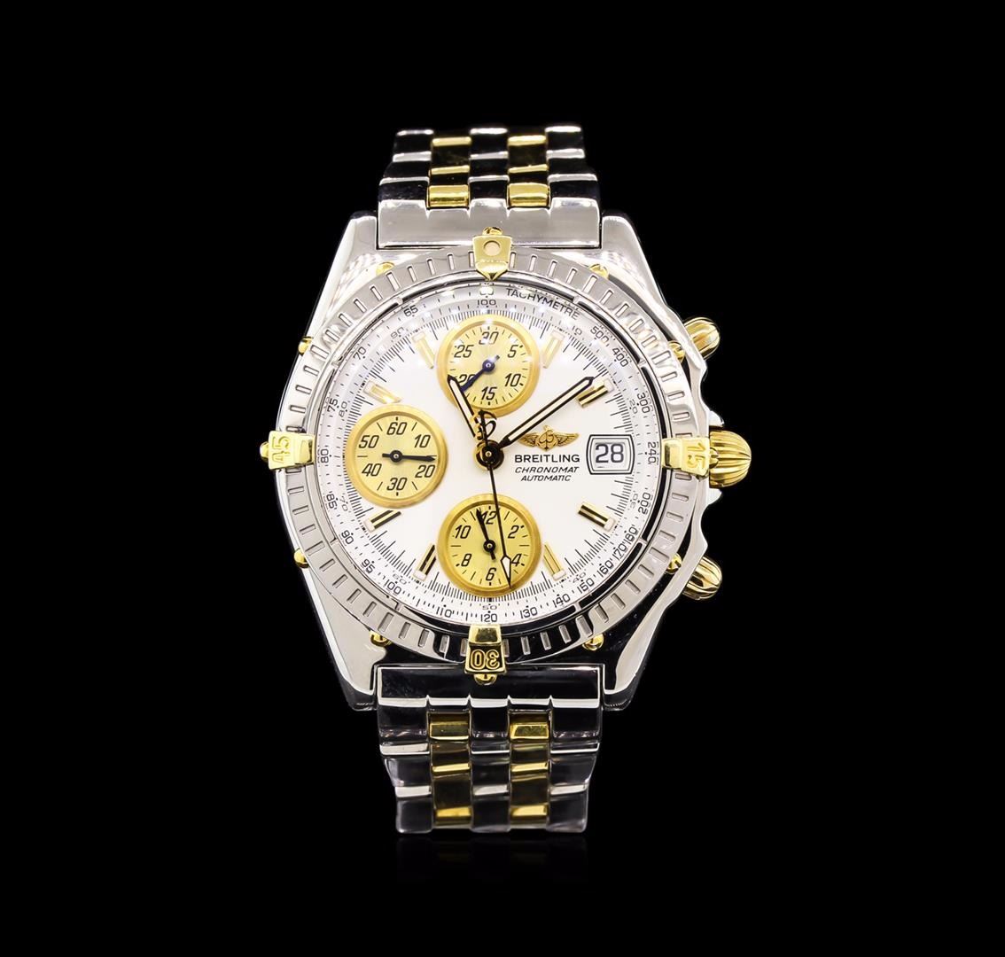 One, Breitling Chronomat Chronograph wristwatch electronically tested Stainless Steel, Case: 40mm diameter, Case Back: engraved with the manufacturers name, logo, and ID numbers, Scalloped Crown: 18KT yellow gold, Bezel: uni-directional, engraved with indices and set with four 18KT yellow gold raised stations, Crystal: synthetic sapphire, Movement: Breitling 13, ETA Valjoux 7750, Swiss Automatic Certified Chronometre. Case Ring: Tachymetre scale, Dial: off White color, with baton pointed hands, indices and a bolded minute track, Chronograph Functions: three Gold color sub-dials for continuous seconds, minutes and hours, Date Window: three o'clock position. Pilot Bracelet: Stainless Steel and 18KT yellow gold, adjustable seven and three quarter inch length, with a flip lock clasp. Condition: G-5 Fine. Bright polish finish. Total Weight of Wristwatch 162.05gm. AIG Appraised at $8,850.00.