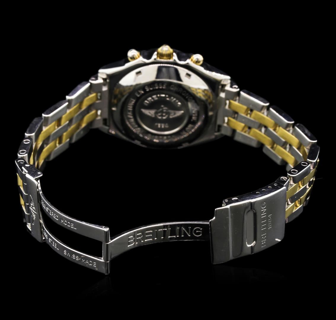 One, Breitling Chronomat Chronograph wristwatch electronically tested Stainless Steel, Case: 40mm diameter, Case Back: engraved with the manufacturers name, logo, and ID numbers, Scalloped Crown: 18KT yellow gold, Bezel: uni-directional, engraved with indices and set with four 18KT yellow gold raised stations, Crystal: synthetic sapphire, Movement: Breitling 13, ETA Valjoux 7750, Swiss Automatic Certified Chronometre. Case Ring: Tachymetre scale, Dial: off White color, with baton pointed hands, indices and a bolded minute track, Chronograph Functions: three Gold color sub-dials for continuous seconds, minutes and hours, Date Window: three o'clock position. Pilot Bracelet: Stainless Steel and 18KT yellow gold, adjustable seven and three quarter inch length, with a flip lock clasp. Condition: G-5 Fine. Bright polish finish. Total Weight of Wristwatch 162.05gm. AIG Appraised at $8,850.00.