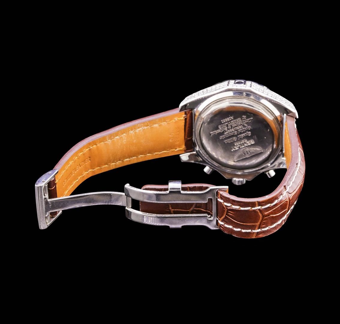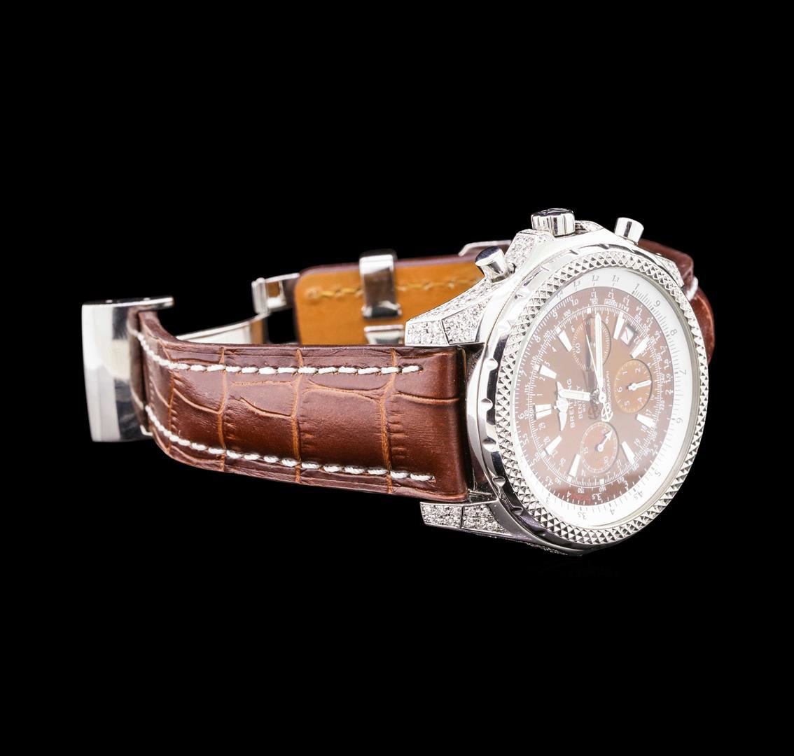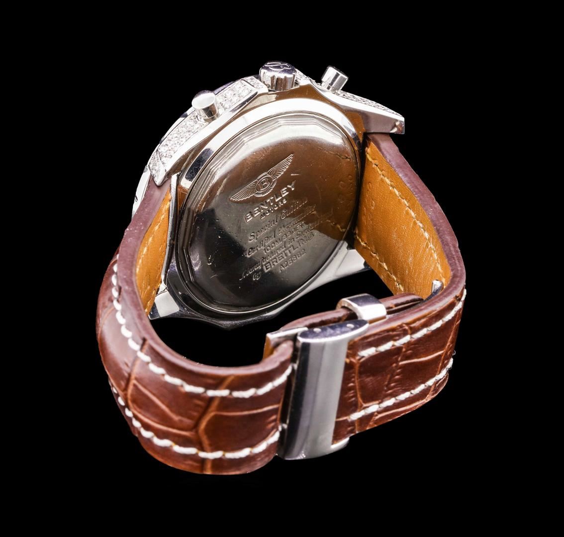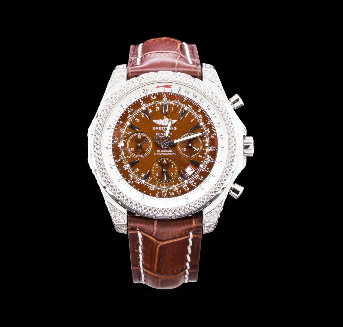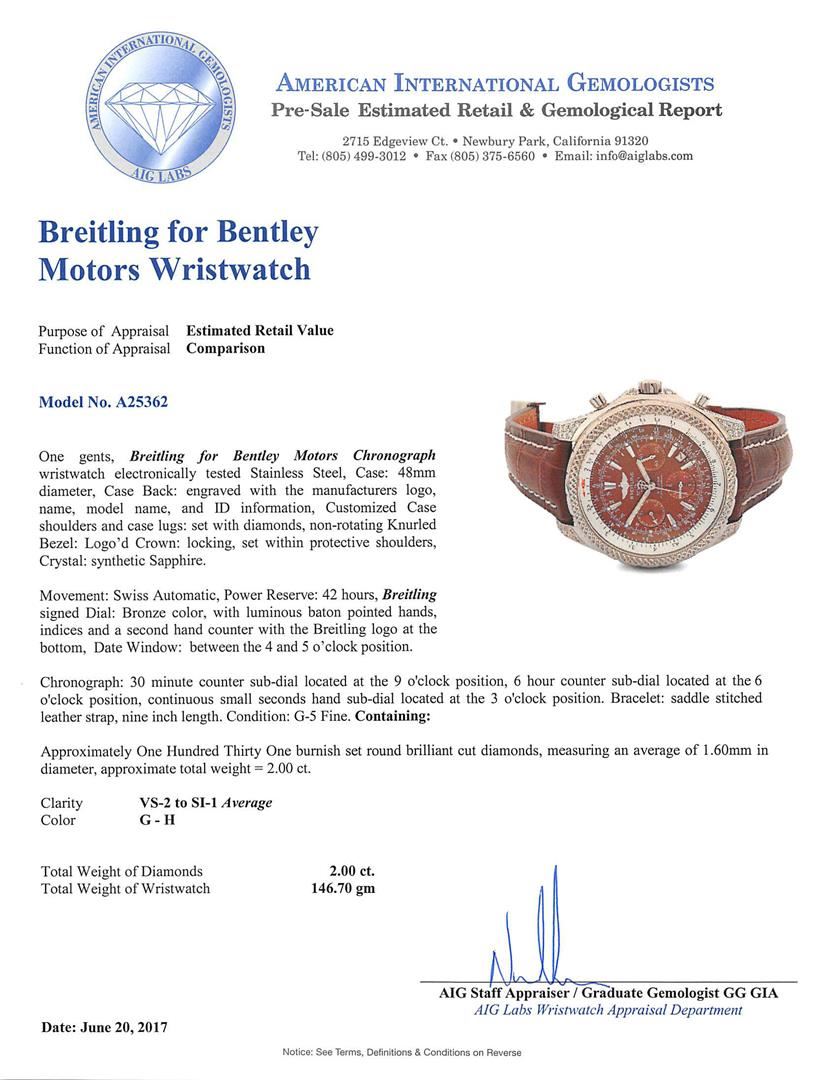 One gents, Breitling for Bentley Motors Chronograph wristwatch electronically tested Stainless Steel, Case: 48mm diameter, Case Back: engraved with the manufacturers logo, name, model name, and ID information, Customized Case shoulders and case lugs: set with diamonds, non-rotating Knurled Bezel: Logo'd Crown: locking, set within protective shoulders, Crystal: synthetic Sapphire.Movement: Swiss Automatic, Power Reserve: 42 hours, Breitling signed Dial: Bronze color, with luminous baton pointed hands, indices and a second hand counter with the Breitling logo at the bottom, Date Window: between the 4 and 5 o'clock position. Chronograph: 30 minute counter sub-dial located at the 9 o'clock position, 6 hour counter sub-dial located at the 6 o'clock position, continuous small seconds hand sub-dial located at the 3 o'clock position. Bracelet: saddle stitched leather strap, nine inch length. Condition: G-5 Fine. Containing:Approximately One Hundred Thirty One burnish set round brilliant cut diamonds, measuring an average of 1.60mm in diameter, approximate total weight = 2.00ct. Clarity VS-2 to SI-1 AverageColor G - H. Total Weight of Diamonds 2.00ct. Total Weight of Wristwatch 146.70gm. AIG Appraised.