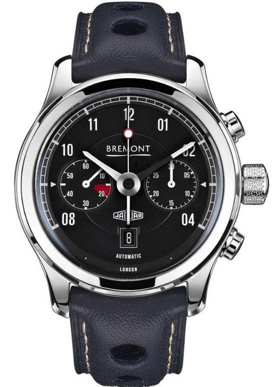 Bremont Watch Jaguar Lightweight E-Type MKII. With white dots added to the locations of the missing hour points, and the back of the watch. The winding weight takes the form of miniature three spoke E Type steering wheel. The Jaguars head sits in the very centre of the watch and the Bremont watch is 43mm wide and 16mm with a water resistance of 100 meters, the Bremont Jaguar is finished on a beautiful black calfskin strap with cream stitching and a polished stainless steel pin buckle.