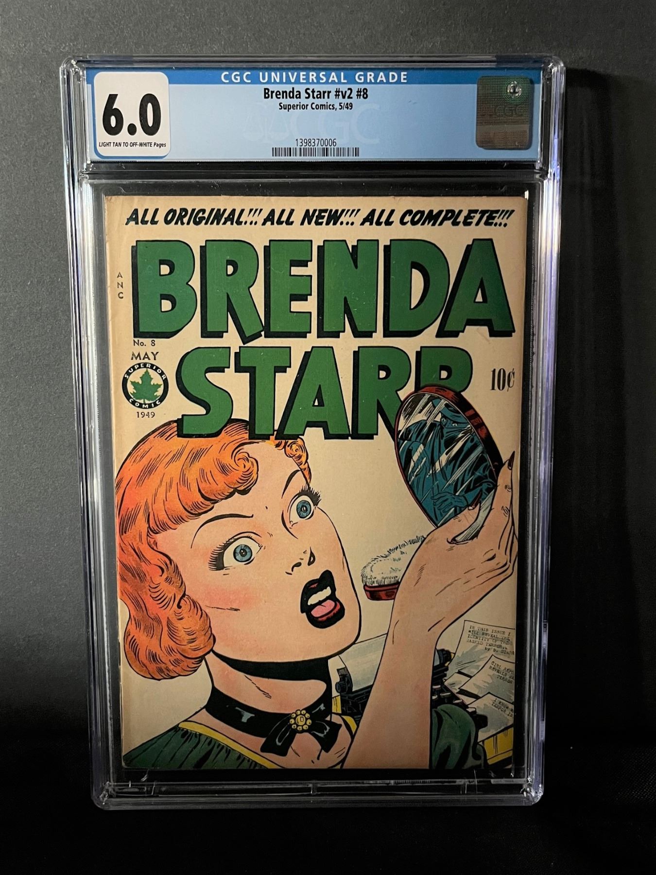Brenda Starr covers are notorious for the sublime and this cover is no different. In the mirror of the cosmetic kit we see the stalker and our starr reporter's reaction to seeing it is priceless. We are a veteran owned company. Please look at the pictures carefully to determine what you believe the condition of collecitible is. We are currently accepting consignments. Email us a aeronhouse1994@gmail.com or visit our website, www.ahauctionhouse.com