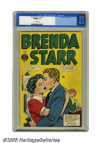 <B>Brenda Starr V2#11 (Superior, 1949) CGC VF/NM 9.0 Off-white pages.</B></I> This issue is scarce according to both Overstreet and Gerber. These are all-new adventures of the lady reporter, not strip reprints. Overstreet 2005 VF/NM 9.0 value = $637; NM- 9.2 value = $860. CGC census 2/05: 1 in 9.0, 1 higher.