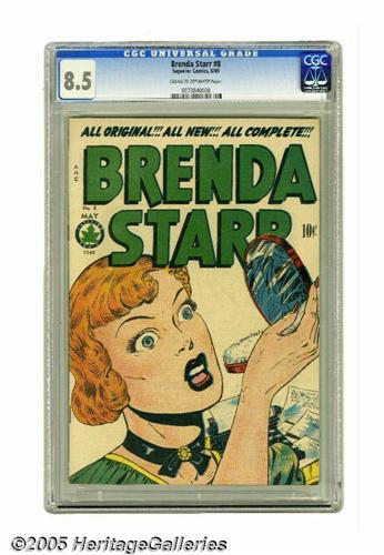 <B>Brenda Starr V2#8 (Four Star, 1949) CGC VF+ 8.5 Cream to off-white pages.</B></I> This issue has all-new material (as opposed to the reprints of Dale Messick's long-running strip that filled the early issues). Have a close look at Brenda's compact and you'll see why the intrepid girl reporter is glad she decided to powder her nose! Our offering is the only copy of the issue that CGC has certified to date. Overstreet 2005 VF 8.0 value = $406; VF/NM 9.0 value = $628. CGC census 6/05: 1 in 8.5, none higher.