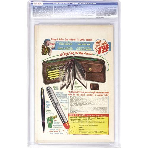 <B>Brenda Starr V2#9 Davis Crippen ("D" Copy) pedigree (Superior, 1949) CGC NM- 9.2 Off-white to white pages.</B></I> It appears that Jack Kamen either drew or had a hand in drawing this issue's bizarre cover! Overstreet 2006 NM- 9.2 value = $875. CGC census 6/06: 1 in 9.2, 2 higher. <I>From the Crippen Collection.</B></I> <BR><BR><B>Important notice:</B> Heritage usually auctions material at the rate of 200-250 lots per hour. On some occasions eBay Live bid software or the Internet may not be able to keep up with the pace of the auction. We recommend placing a realistic absentee bid now as insurance to avoid disappointment. Occasionally the auctioneer may eliminate or reject an eBay Live bid, and the auctioneer may also reopen a lot after the close of the eBay live bidding (usually because we missed an audience bid), and may reject your bid even if it shows you as the winning bidder. By bidding via eBay Live, you agree that Heritage may award the lot to another bidder at its sole discretion under the circumstances described above or any other reasonable circumstances. Since eBay bids are not shown to us until we open the lot on the floor, we treat those bids just like floor bids. In most cases the floor responds before the eBay bid is presented to us, due to Internet lag time, so for consistency we have made it a policy that floor bids are always considered first over tie eBay live bids. Also please note that all Heritage lots purchased through eBay Live carry a 22.5% Buyer's Premium. Please make sure you read the Terms and Conditions before you bid. This lot is being auctioned in conjunction with a live floor auction by Heritage Auction Galleries. All final auction and invoice information will be supplied by Heritage Auction Galleries, and all other information should be considered preliminary. Lot:41001 <BR><BR><B>Winning Notification and Billing:</B> After the FINAL session in this auction is complete, Heritage will send e-mail and snail mail invoices. This process normally takes several days. All final auction and invoice information will be supplied by Heritage Auction Galleries, and all other information should be considered preliminary. <BR><BR>This auction will be conducted on a live auction floor and over the Internet through eBay Live. If you choose to place an absentee bid, please take a moment to <font color='#0000ff'><u><a href='http://pages.ebay.com/liveauctions/help/before/laabsentee.html'>learn how eBay Live absentee bidding works</a></u></font><font color='#000000'>