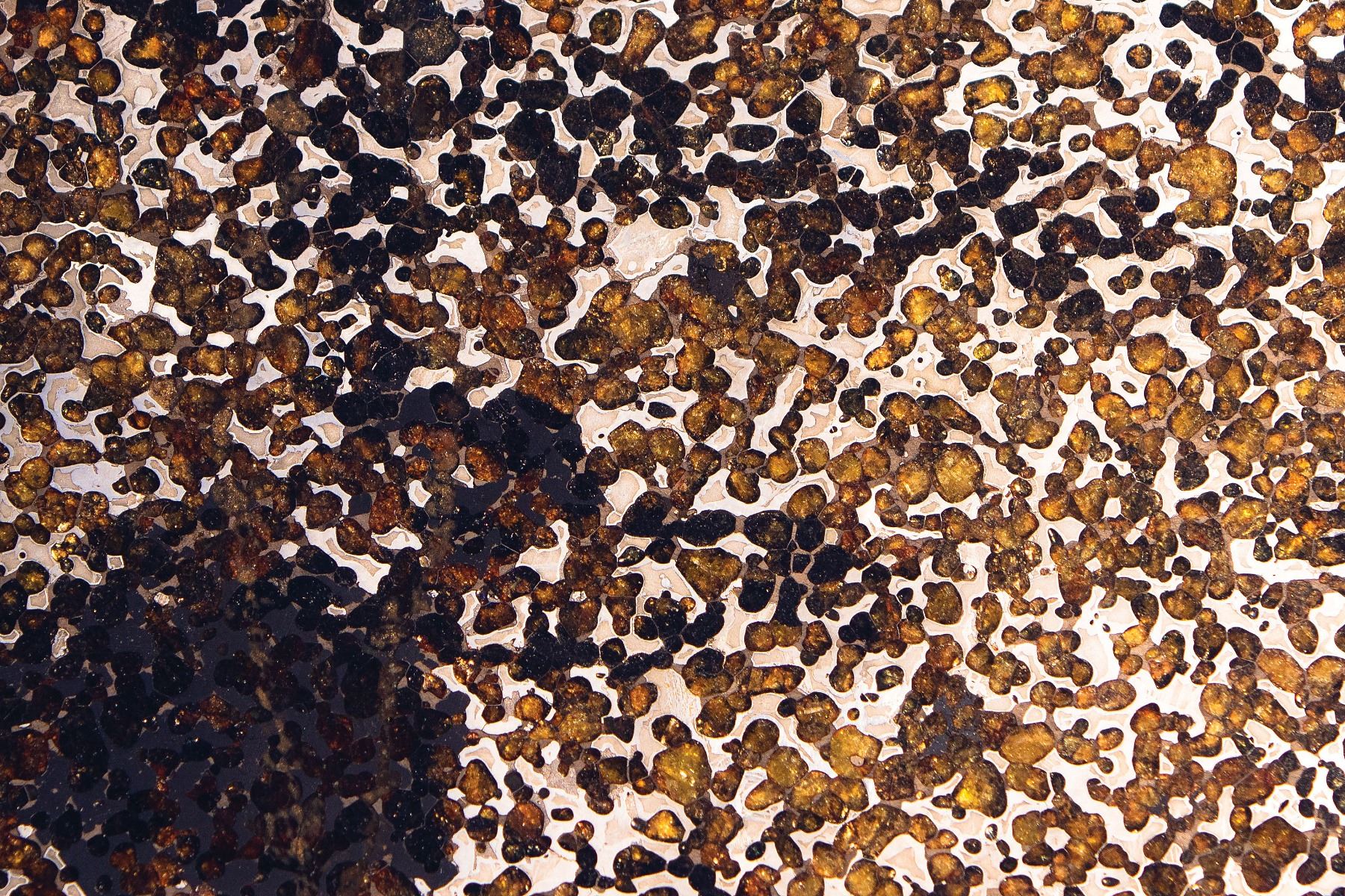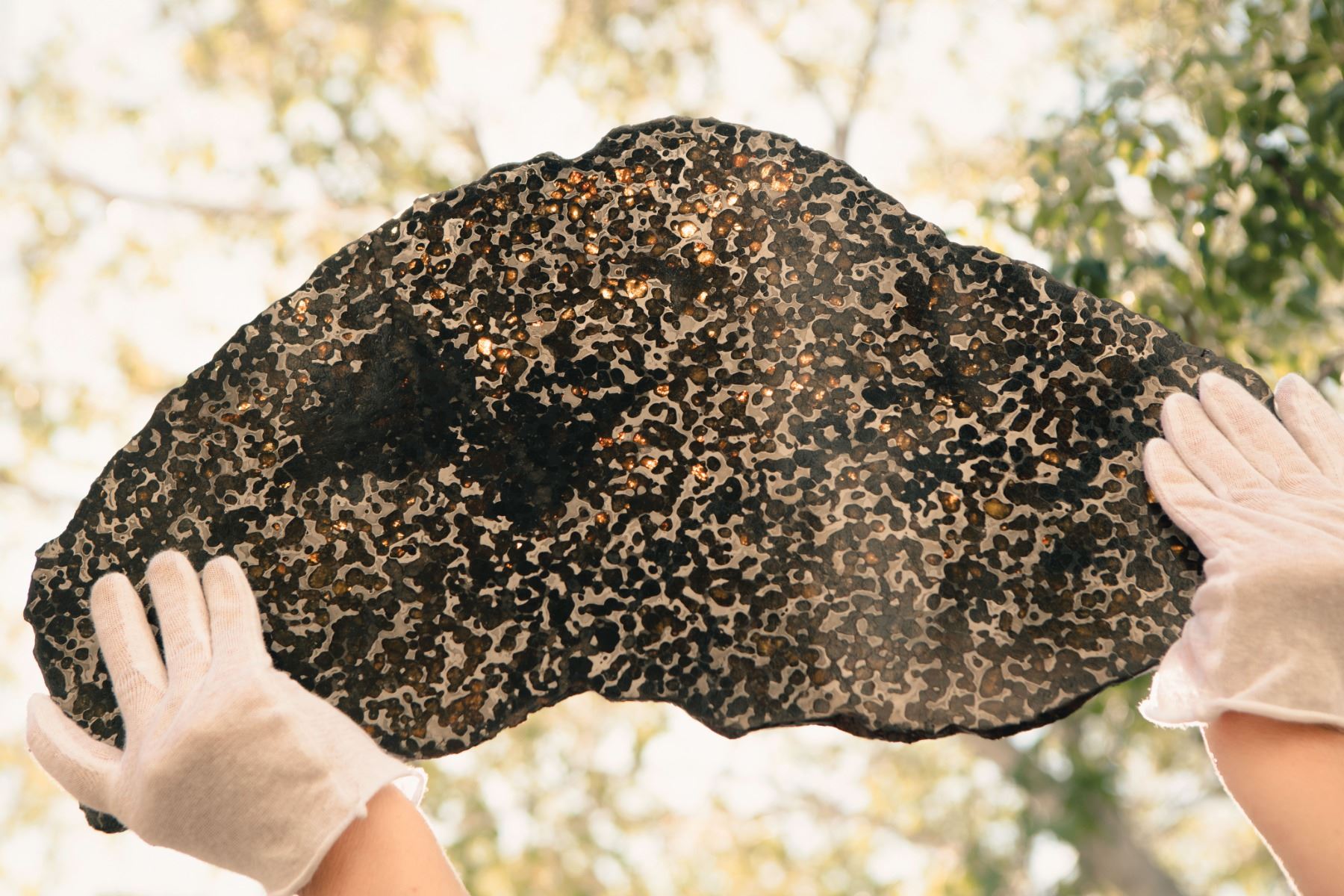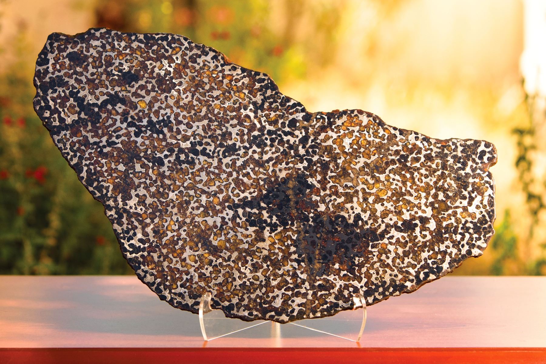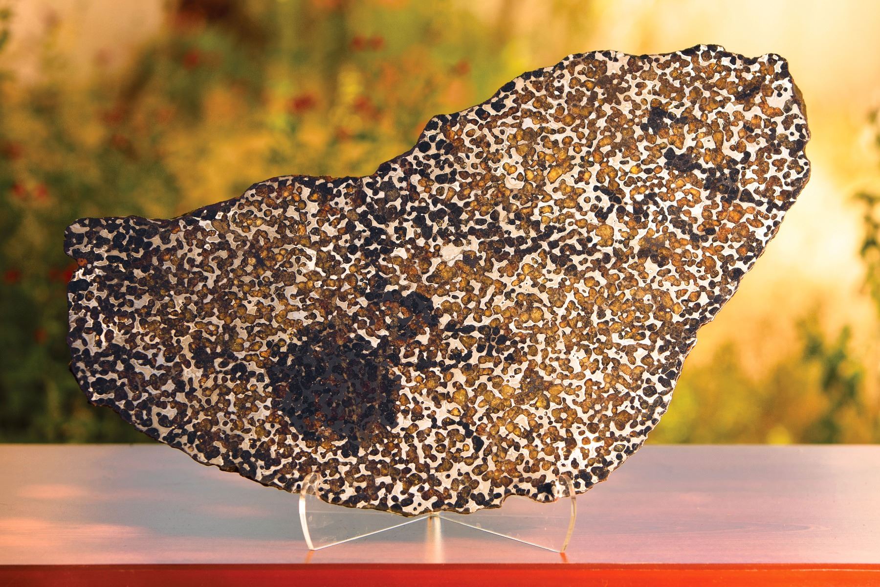 Taken from one of Arnold’s personal finds, made circa 2006, this magnificent full slice is giddily awash in coffee bean-shaped yellow and green extraterrestrial gemstones. Note the large, dark green, and ball-shaped olivine cluster, slightly off from the center. The shape of the slice—reminiscent of a letter “D”—indicates that the original whole mass was oriented, much like Arnold’s record-breaking 650-kg find. It maintained a fixed orientation towards Earth during flight, and the leading edge ablated into a gentle cone shape. So, even after cutting and preparation in the laboratory, the vestiges of this meteorite’s tumultuous flight through our atmosphere can still be seen written into its luminous shape.