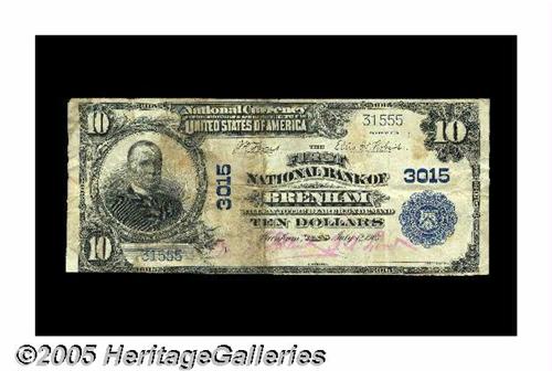 <B>Brenham, TX</B></I> - $10 1902 Plain Back Fr. 624 <B>The First NB</B></I> Ch. # 3015<BR>A seldom seen bank in large size, although there is some staining on both the front and back of this example. <B>Fine-Very Fine.</B></I>