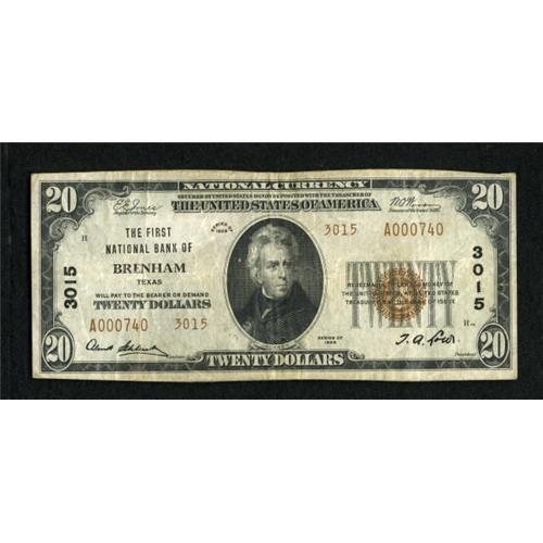 <B>Brenham, TX</B></I> - $20 1929 Ty. 2 <B>The First NB</B></I> Ch. # 3015<BR> A lone pinhole is noted on this well margined and pleasingly original piece. <B>Very Fine.</B></I><BR><BR><b>Shipping:</b> Coins & Currency (<a target="_blank" href="http://www.heritageauctions.com/common/shipping.php">view shipping information</a>)