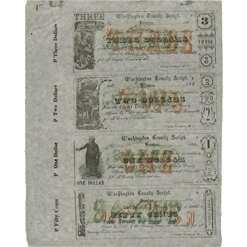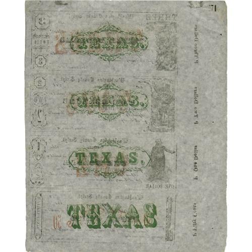 <B>Brenham, TX - Washington County Scrip</B></I> $3-$2-$1-50¢ Uncut Sheet Medlar 5-4-3-2<BR> An uncut sheet of remainders, complete with extra selvage at the left. A few minor corner and edge folds and some light handling are present. Very scarce as an uncut sheet. <B>Crisp Uncirculated</B></I>.<BR><BR><b>Shipping:</b> Coins & Currency (<a target="_blank" href="http://www.heritageauctions.com/common/shipping.php">view shipping information</a>)
