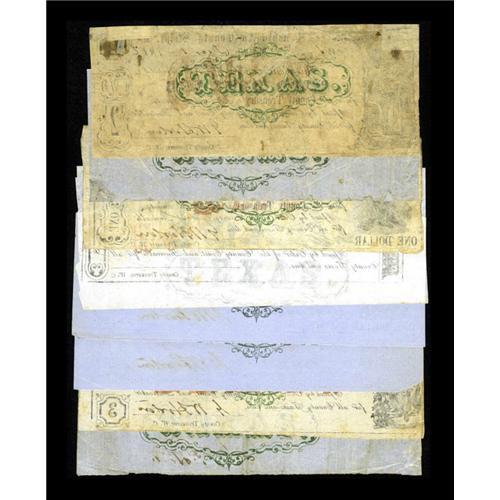 <B>Brenham, TX- Washington County Script (sic)</B></I> 50¢; $1 (2); $2 (2); $3 (2); $5 1862 Medlar 2; 3; 4; 5; 6<BR>Two different paper color varieties are in this lot. The 50¢ remainder is on white paper and the $5 is on blue paper. The $1s, $2s, and $3s are on both white and blue paper in this lot. The notes range in grade from <B>VG to AU.</B></I> Ink ersoion is noticed on the white $1, the blue $2 has a clipped corner tip, the white $2 repairs, the blue $3 was once mounted, and the white $3 has a missing corner tip.<BR><I>From The William A. "Bill" Bond Collection</B></I><BR><BR><b>Shipping:</b> Coin/Currency (<a target="_blank" href="http://www.heritageauctions.com/common/shipping.php">view shipping information</a>)