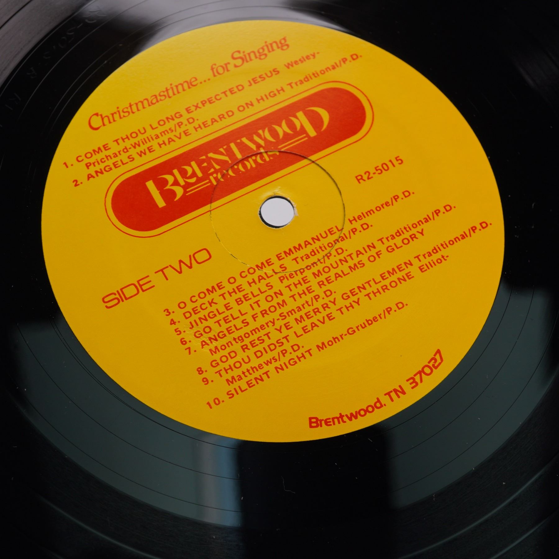 Christmastime... for Singing, a sing-along stereo Christmas album released by Brentwood Records (R2-5015), featuring traditional holiday hymns and carols performed by The Bridge. Includes favorites like Joy to the World, Silent Night, Deck the Halls, O Holy Night, and Jingle Bells. Bright holiday cover artwork with illustrated carolers and full song listing on reverse. Vinyl and jacket both show light handling wear, visually VG.