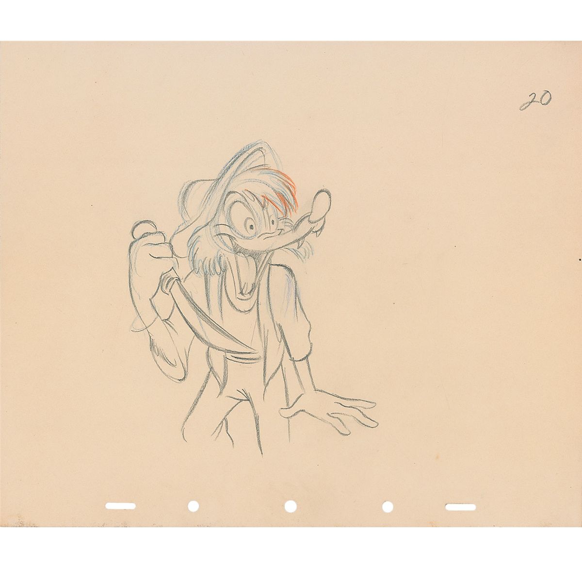 (Walt Disney Studios, 1946) Original production drawing featuring Brer Fox from Song of the South, showing him holding a large knife. Accomplished in graphite and colored pencil on untrimmed 12 x 10 animation paper. Image measures 5 x 6.5. In fine condition.