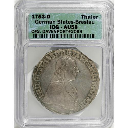 <B>Breslau. Philipp Gotthard Taler 1753D,</B></I> KM-C2, Dav-2053, AU58 ICG. Medium gray toning with a nice strike.<BR><BR><b>Shipping:</b> Coin/Currency (<a target="_blank" href="http://www.heritageauctions.com/common/shipping.php">view shipping information</a>)