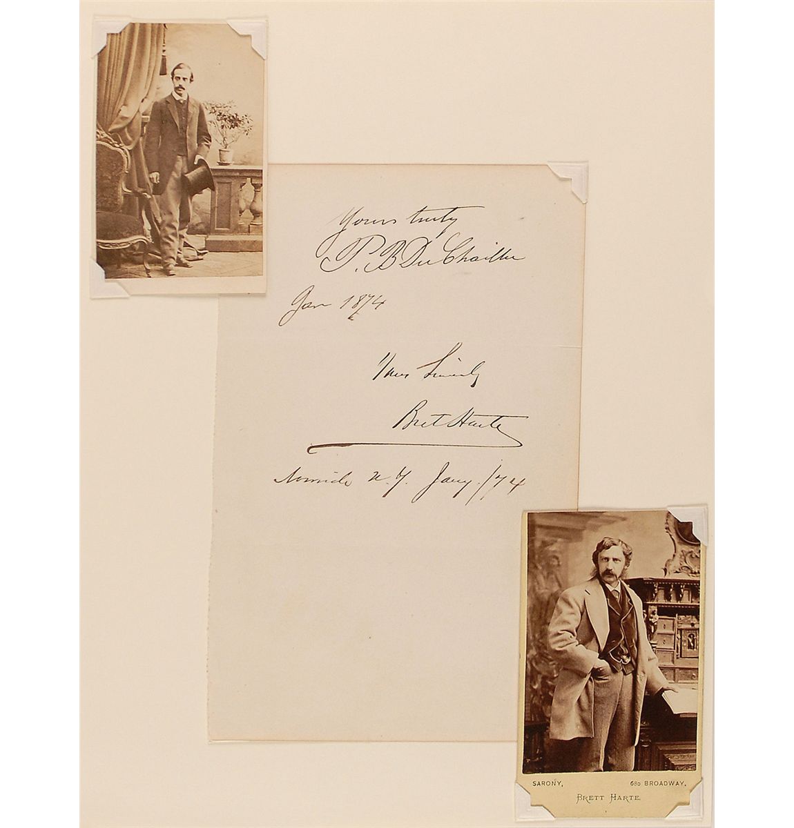 Ink signatures, “Yours truly, P. B. Du Chaillu, Jan 1874,” and “Yours sincerely, Bret Harte, Norwich, N. Y., Jany/74,” on an off-white 4.75 x 7.5 sheet. In fine condition, with two horizontal folds and some scattered light toning. Accompanied by unsigned carte-de-visites of Chaillu and Harte.