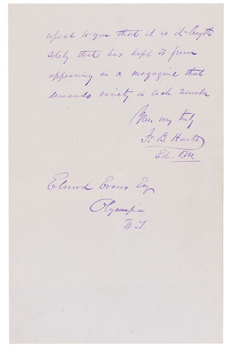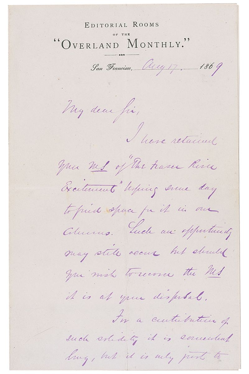 ALS signed “Fr. B. Harte,” two pages on two adjoining sheets, 5.25 x 8.25, Overland Monthly letterhead, August 17, 1869. Letter to an aspiring writer. In part: “I have retained your MS of ‘The Fraser River Excitement’ hoping some day to find space for it in our columns…but should you wish to recover the MS it is at your disposal. For a contribution of such solidity it is somewhat long, but it is only just to repeat to you that it is its length solely that has kept it from appearing in a magazine that demands variety in each number.” In fine condition, with central vertical and horizontal folds.