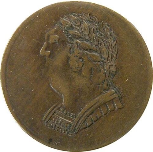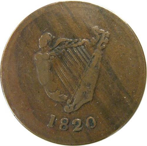Canada Pre-Confederation Token. Breton 1012, 1820 Imitation Bust & Harp Token, Nine Strings, Copper, CH LC-60E3. Not listed in Ingram-Marelic, but the same as BH-15, With Collar, except in copper, Cornwell EF. Listed as Very Rare in Charlton. A rather sharp and nicely detailed example