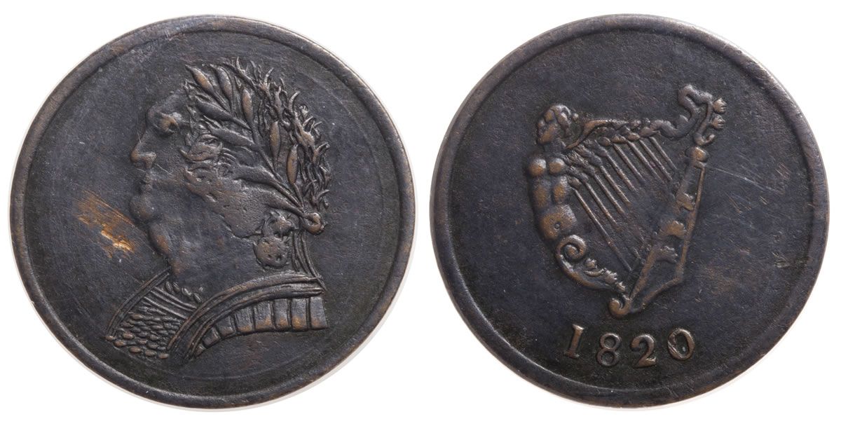 LC-60E4. Halfpenny 1820. Imitations issued ca. 1830, dated 1820; nine strings, Brass. ICCS graded Extremely Fine-40.