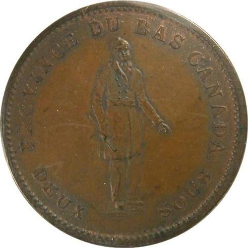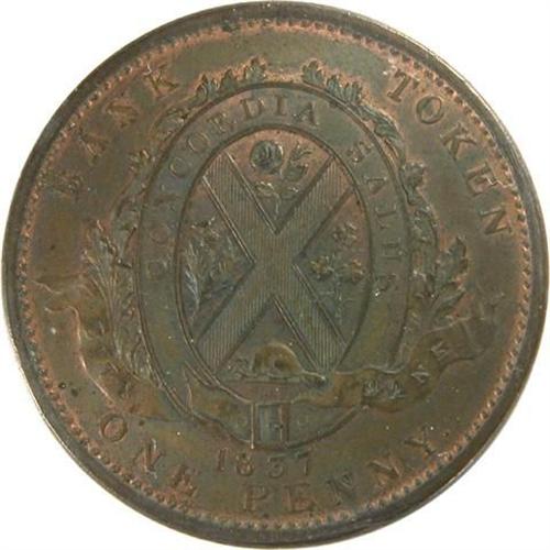 Breton 521 Lower Canada, City Bank 1837 Penny, Weak Ground, Period, Medal, LC-9A3, ICCS MS-60. Some traces of remaining red