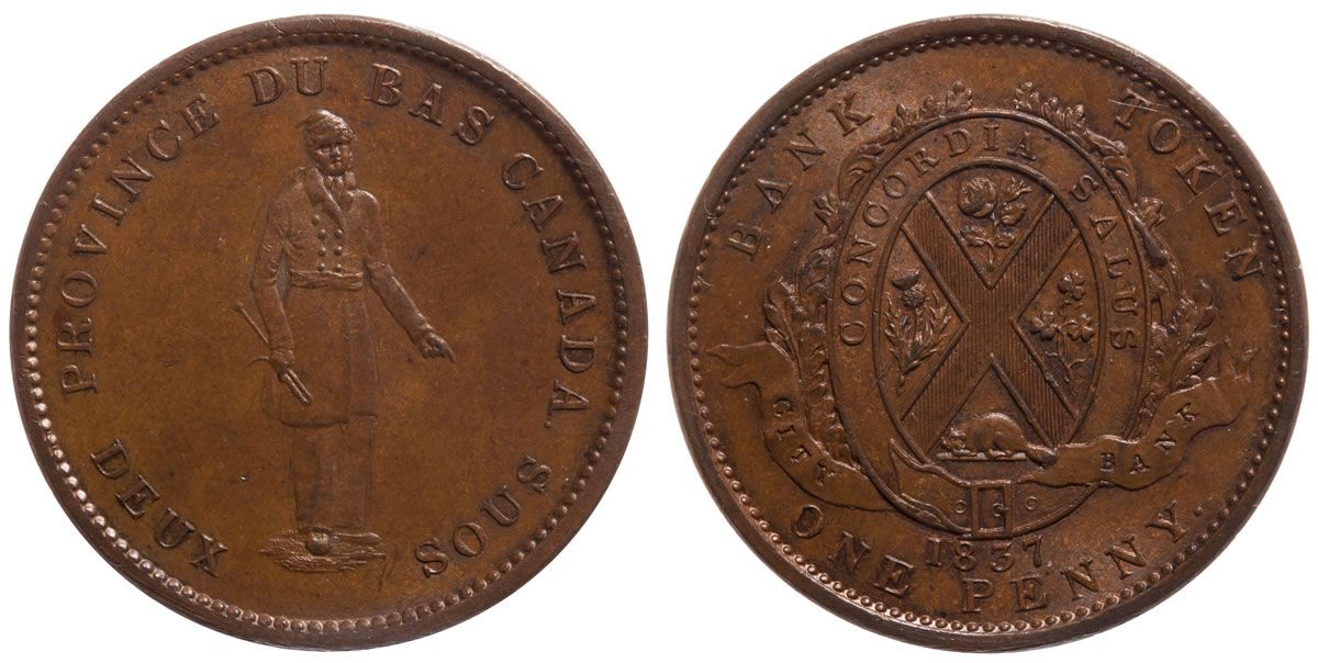 LC-9A3. One Penny 1837 – Province Du Bas Canada, Deux Sous; City Bank On Ribbon; Weak, Period. ↑↑. ICCS graded Unc-60.