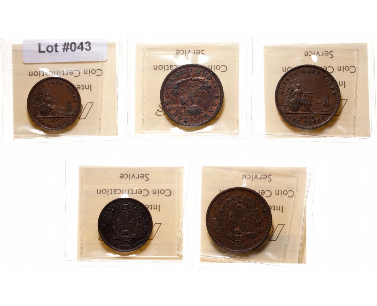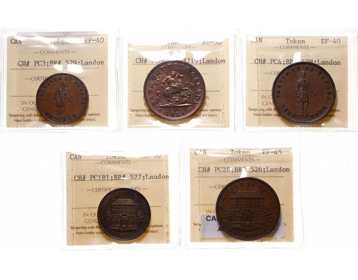 Breton-526. PC-2B. 1842. 1d. Bank of Montreal. ICCS Extra Fine-45; Breton-527. PC-1B1. 1842. 1/2d. ICCS AU-50; Breton-528. PC-4. 1852. 1d. Quebec Bank Token. ICCS Extra Fine-40; Breton-719. PC-6C1. 1d. 1854. Plain 4. ICCS AU-50; Breton-529. PC-3. Quebec Bank 1/2d. 1852. ICCS Extra Fine-40. Lot of five (5) tokens.