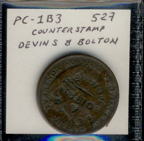 Breton 527 PC-1B3. 1844 Half Penny issue Counterstamped DEVIN & BOLTON. VG with cracked die.