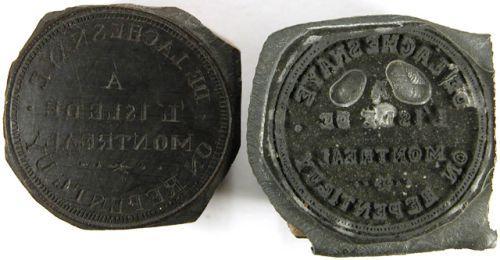 Breton 534 to 537 de Lachesnay a lIsle de Montreal on Repentguy. Cast White Metal Printing Plate for obverse. Plus Leroux 114, de Lachesnay a lIsle de Montreal on Repentguy. Carved Wooden Printing Block for obverse. Two related pieces