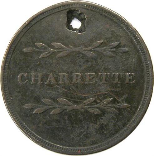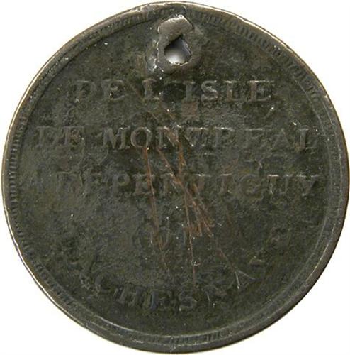 Canada Pre-Confederation Token. Breton 539, Bout de lIsle Token, A Repentigny, Charrette, VF holed. A scarce piece with a crudely punched hole at 12 oclock, some minor corrosion and shallow scratches
