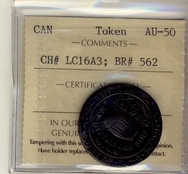 Breton 562 LC-16A3 ICCS AU50. Rare Molson's token in high grade.