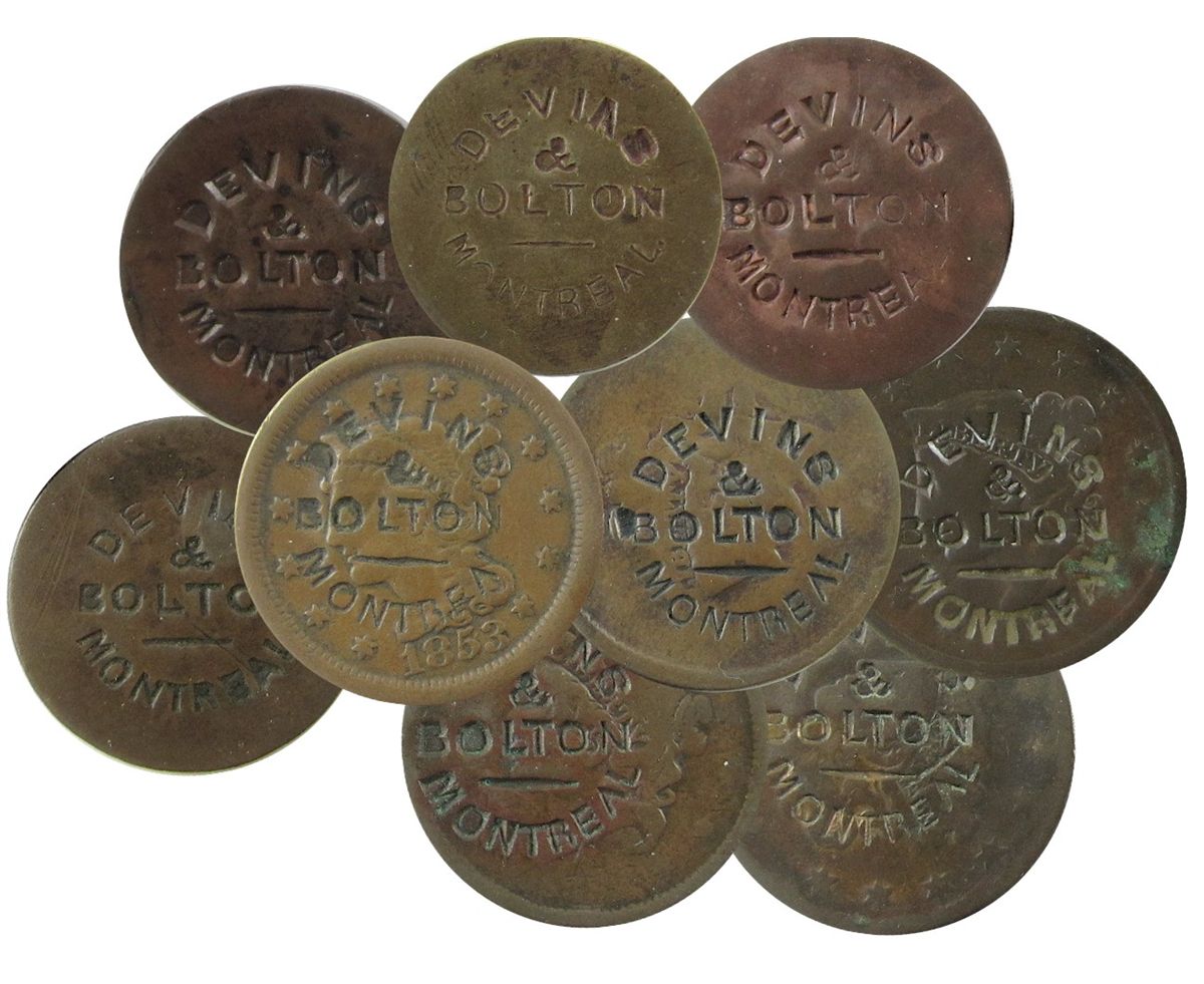 Breton 569a Devins & Bolton countermarked coins: Group of 9 different pieces: 5 on U.S. large cents of various dates, 4 on unidentifed copper and brass tokens/planchets. Two of these 4 pieces are c/m with a different type, thinner letters and much slant.
