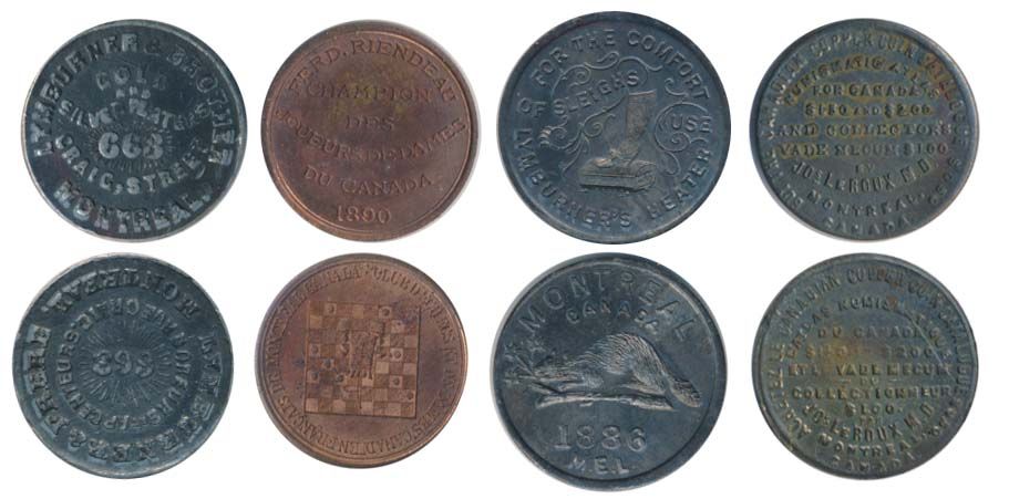 Lymburner. White metal. Breton-581. Lymburner. Up-right dies. Breton-582. Jos LeRoux. English. Brass; Breton-587a. Ler-1526. Checker Club. Rev. Fred Riendeau. Lot of four (4) tokens. All AU or better.