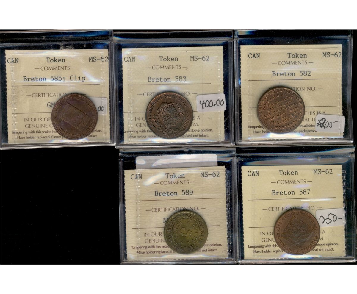 Breton 582,583,585 Clip,587 &589 ICCS MS62. Lot of 5 tokens.