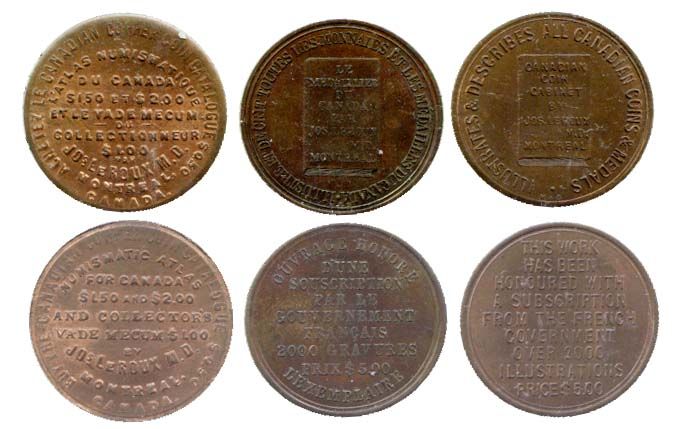 Jos. LeRoux. English & French. Copper. ICCS Mint State-63; Breton-585. LeRoux Coin Cabinet. French. ICCS Mint State-60; Breton-586. LeRoux Coin Cabinet. English. ICCS Mint State-62. Lot of three (3) tokens.