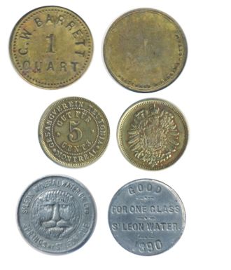 Gesangverein. 5 Cents/Arms. Brass. EF; Breton-618. St. Leon Water. 1890 (large). Alum. EF; C.W. Barrett. 1 Quart/Uniface. Brass, thin, plain edge. EF. Lot of three (3) tokens.